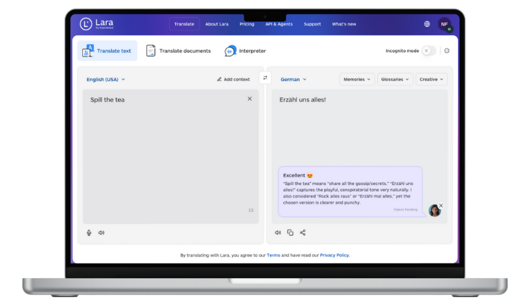 For brand consistency, Lara Translate supports glossaries and translation memories so recurring community terms, product nicknames, and preferred phrasing stay consistent across markets. It can also explain choices and flag ambiguity, which helps when slang has multiple plausible meanings and you need a safer option.