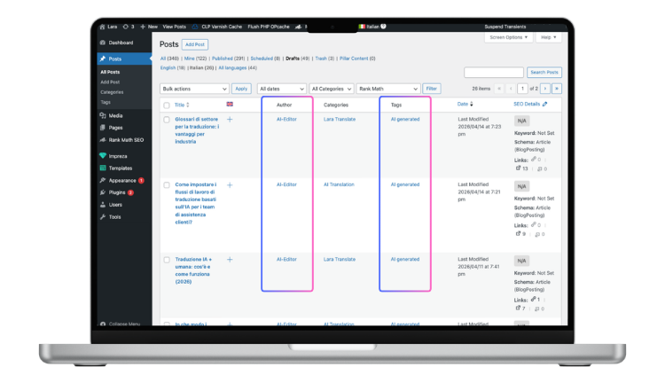 Here’s a real example of what this looks like running live. Lara Translate operates an automated daily workflow that uses Claude, the Lara Translate MCP server, and the WordPress REST API to translate English blog posts into Italian and save them as drafts for human review.