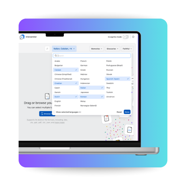 You can translate text, documents, and integrated workflows across all these languages while keeping tone and terminology under control with styles, glossaries, and translation memories.